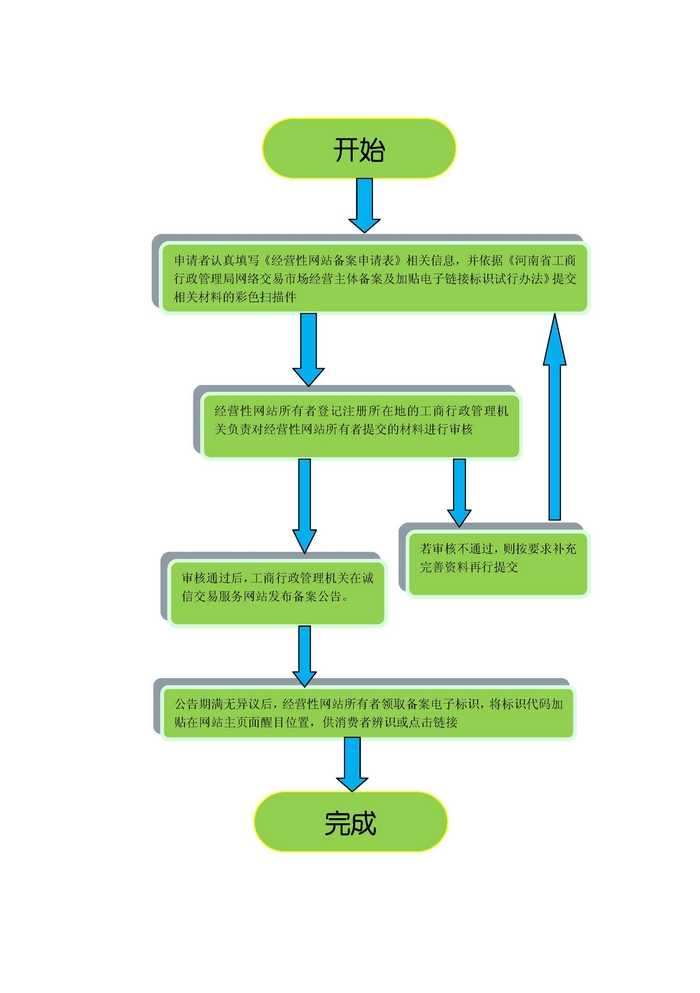 (一)經(jīng)營性網(wǎng)站所有者通過訪問河南省工商行政管理局網(wǎng)絡(luò)誠信交易服務(wù)網(wǎng)站http://wj.haaic.gov.cn),在線填寫《經(jīng)營性網(wǎng)站備案申請表》相關(guān)信息,并依據(jù)《河南省工商行政管理局經(jīng)營性網(wǎng)站備案及加貼電子鏈接標(biāo)識試行辦法》提交相關(guān)材料的彩色掃描件(規(guī)格:圖片格式為jpgbmp、色彩位數(shù)8-16位、掃描分辨率150-200 dpi。);