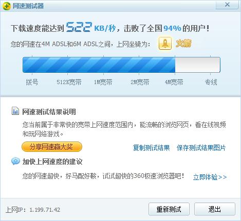 才4M的帶寬,360居然說我的網(wǎng)速是“火箭”級(jí)的,真是頭暈。我的幾個(gè)朋友,他們用的都是10M的寬帶,比我的強(qiáng)多了。