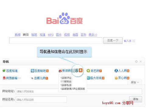 這種類似網(wǎng)絡(luò)書簽的導航功能,百度搜藏已經(jīng)可以實現(xiàn),這次百度在其首頁增加這種自定義網(wǎng)址功能,可能想讓百度能成為更多人的個人首頁,讓那些不屑于使用hao123的用戶能夠在IE瀏覽器下方便訪問自己常用的網(wǎng)站,對于Chrome和Firefox瀏覽器用戶來說,其已經(jīng)實現(xiàn)了自動同步,新建標簽頁會自動顯示常用的網(wǎng)站,百度的這個新功能可能更多針對IE用戶設(shè)計。它的作用是訪問其他網(wǎng)站的便捷入口,系統(tǒng)將自動推薦你常訪問的網(wǎng)站,你還可以主動添加自己喜歡的網(wǎng)站,綁定網(wǎng)站后可接收通知消息。