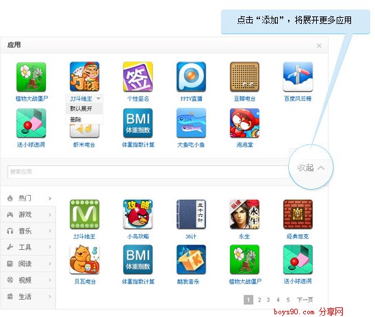 為我們推出眾多的應用,你可以將你喜歡的應用,添加到首頁,每次登錄百度就可以直接使用這些應用。比如植物大戰(zhàn)僵尸,斗地主,百度風云,更多的應用,為我們生活服務(wù)。
