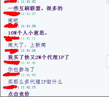 隨著時(shí)間的推長(zhǎng),惡意點(diǎn)擊百度競(jìng)價(jià)的站長(zhǎng)也越來(lái)越多,目前已經(jīng)有人組成10w的站長(zhǎng)參與此事,不惜成本和代價(jià)來(lái)引起百度的重視,下圖是今天早上和一位站長(zhǎng)的聊天記錄。