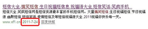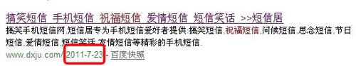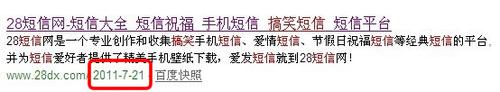 百度算法改變,很多網(wǎng)站快照都是停滯不前,通過(guò)自己的短信網(wǎng)站分析來(lái)看,快照從7月27號(hào)開(kāi)始就不更新了,也許27號(hào)是一個(gè)百度的大更新,快照倒退到21號(hào)后,就一直停滯更新,通過(guò)短信類的網(wǎng)站分析來(lái)看,不僅僅是自己的網(wǎng)站有這個(gè)狀況,其他的短信類排名首頁(yè)前幾位的快照也是更新得很慢:
