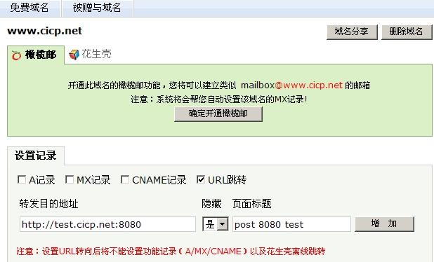 4).添加www.cicp.net三級(jí)域名,這個(gè)域名很重要,是繞過寬帶運(yùn)營(yíng)商的Web端口封鎖關(guān)鍵。 注意這里不需要激活該域名,否則是不會(huì)進(jìn)行URL跳轉(zhuǎn)的。最后,在服務(wù)器上重新登陸“花生殼”程序。最終的結(jié)果如下圖所示。