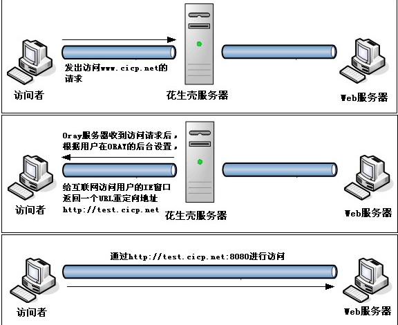 當(dāng)我們?yōu)橛蛎皐ww.cicp.net”設(shè)置了轉(zhuǎn)發(fā)的URL為 “http://test.cicp.net:8080”后,互聯(lián)網(wǎng)用戶訪問www.cicp.net域名的時(shí)候,Oray服務(wù)器會(huì)自動(dòng)檢測(cè)該域名是否設(shè)置了URL轉(zhuǎn)發(fā)。如果是,則告訴該域名真正的地址給訪問者。最后,訪問者直接通過真正的地址http://test.oray.net:8080來訪問Web服務(wù)器。整個(gè)過程如下面的示意圖所示。