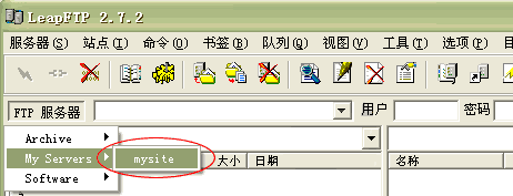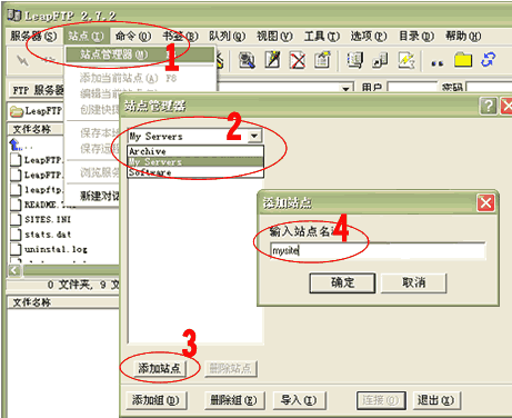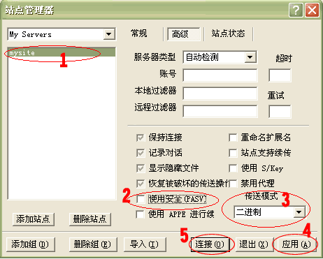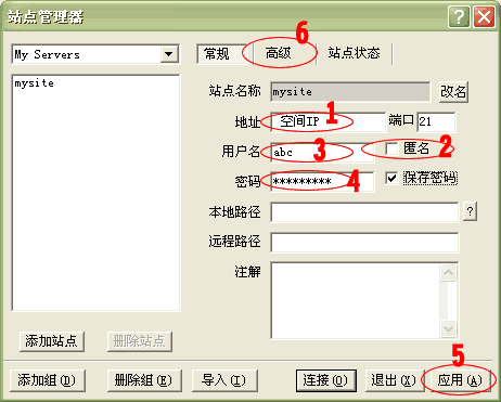 【編輯】 經(jīng)常有客戶詢問如何自己管理網(wǎng)站源文件,下面這篇文章,將詳細為您介紹。 【正文】 1.請先下載并安裝LeapFTP軟件(點此下載)。 2. 運行 LeapFTP,點擊1處(站點->站點管理器),彈出“站點管理器”窗口;在2處選擇“My Servers”項,然后在3處點擊“添加站點”按鈕,在彈出的窗口4處輸入您喜歡的站點名稱(如:mysite); ![]() 3.點擊“確定”后,出現(xiàn)以下界面。在1處輸入您的站點IP地址(如:125.91.12.78),將2處“匿名”前的選鉤去掉,在3處輸入FTP用戶名(如:abc),在4處輸入FTP密碼(將保存密碼前的選鉤打上),點擊5處“應(yīng)用”按鈕; ![]() 4.點擊上圖 6 處, 切換到“高級”標簽(如下圖)。 在1處選中剛建立的站點名稱(mysite),將2處的選鉤去掉,在3處的“傳送模式”選擇二進制,點擊4處“應(yīng)用”。 至此您的FTP站點已經(jīng)建立成功; 5.您可以點擊上圖5處“連接”按鈕,直接進入連接狀態(tài);也可以回到主菜單點擊 “FTP 服務(wù)器”-> “My Servers” -> “mysite” 進入連接狀態(tài)。 6.連接成功后的界面如下圖所示。左上框為本地目錄,您可以通過 1 處的下拉菜單選擇您要上傳文件的目錄,選擇后該目錄下的所有文件都會顯示在這個框里。 選擇您要上傳的文件,并點鼠標“右鏈”->“上傳”, 這時在隊列欄里會顯示正在上傳及未上傳的文件, 當您的文件上傳成功完成后,在命令欄里會出現(xiàn)“傳送完成”的提示,此時在過程目錄欄里就可以看到您上傳的文件了。 ![]() 提示:本系統(tǒng)已開通在線解壓縮的功能,您只需要上傳壓縮包后在虛擬主機管理》》高級管理功能處進行解壓縮既可。 編輯:葵花雨 |